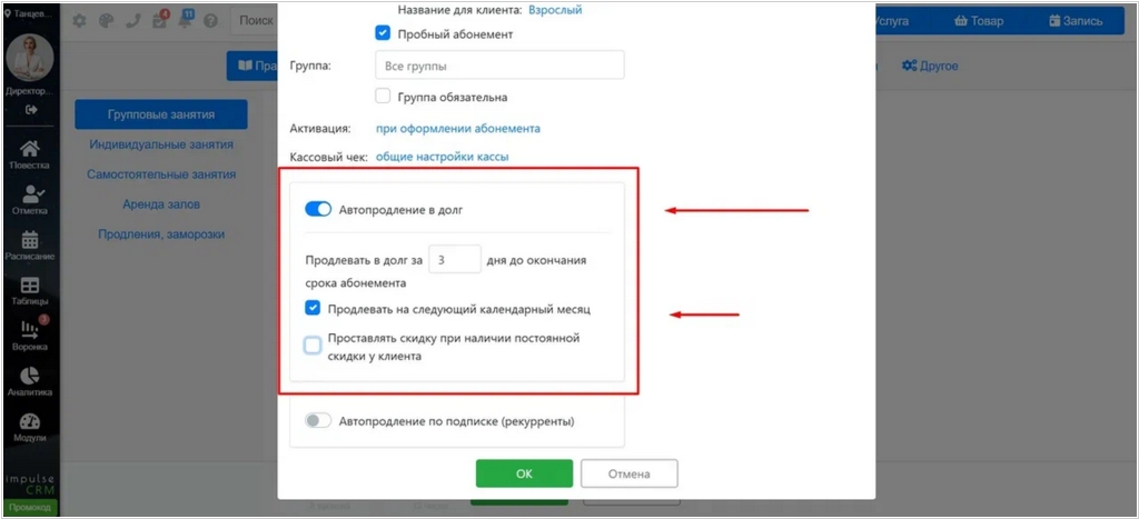 В системе impulseCRM появилась возможность автоматического продления абонементов в долг - теперь контролировать посещения и оплаты стало ещё удобнее. В настройках можно указать за сколько дней до окончания срока действия продлить абонемент, и система сама сделает это, избавляя администратора от ручного контроля. Также можно настроить, чтобы новый абонемент оформлялся на следующий календарный месяц. Эта функция особенно удобна, если в студии абонемент привязывается строго к календарному месяцу и действует с первого по последнее число месяца. С новым функционалом клиенты больше не теряют доступ к занятиям, а администраторы не тратят время на напоминания.