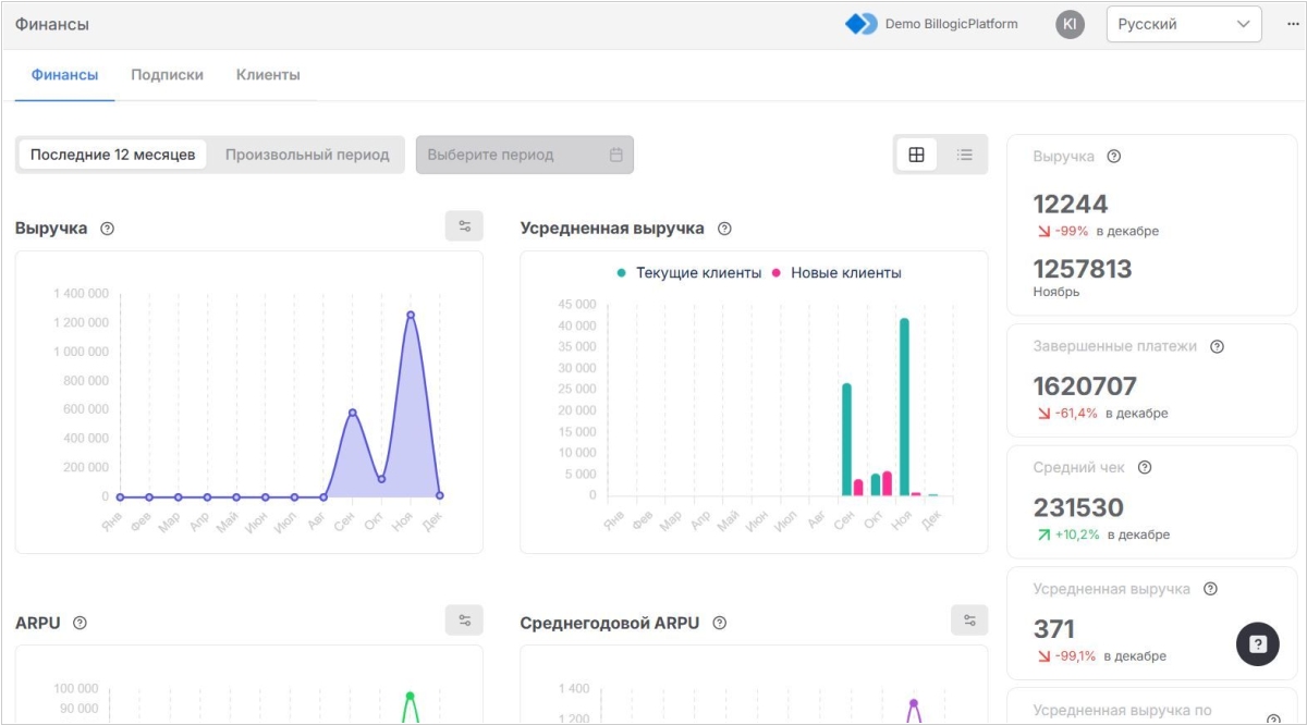 В новой версии BillogicPlatform 9.8 появились вебхуки - механизм автоматической отправки уведомлений во внешние системы при наступлении определённых событий. Они позволяют интегрировать платформу с внешними сервисами без периодического опроса API. Платформа BillogicPlatform сама отправляет запросы на заданный URL при наступлении события в жизненном цикле подписки: создание, активация и остановка подписки, смена тарифного плана, изменение объема ресурсов подписки. Также, в сервисе появился Центр аналитики, в котором собраны все ключевые отчеты и дашборды: Финансы (выручка, MRR/ARR, потери по продлениям, средний чек и т.д), Клиенты (динамика притока и оттока, показатели активности, доля новых клиентов), Подписки (активные/неактивные, пробные / коммерческие, среднее число подписок на клиента, показатели удержания, разделение по продуктам и категориям).